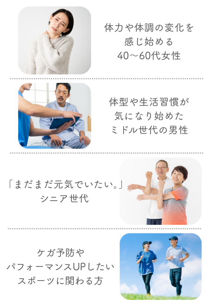 ただ健康を目指しましょうだけでは終わらせない。「ゴルフが上手くなりたい」「美しい体になりたい」「元気に子どもと遊びたい」その“人生の目的”まで、私たちは伴走します。